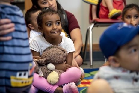 Located on the first floor, the children's area includes smaller tables for children and their caretakers to read and study.