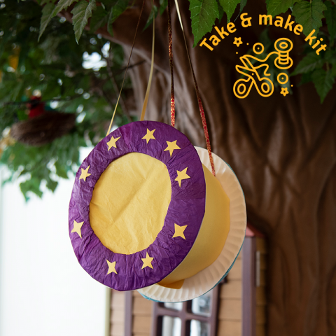 - Wrap one paper plate ring with blue tissue paper, and glue or tape in place. The ring will face the lantern, curving away from you.